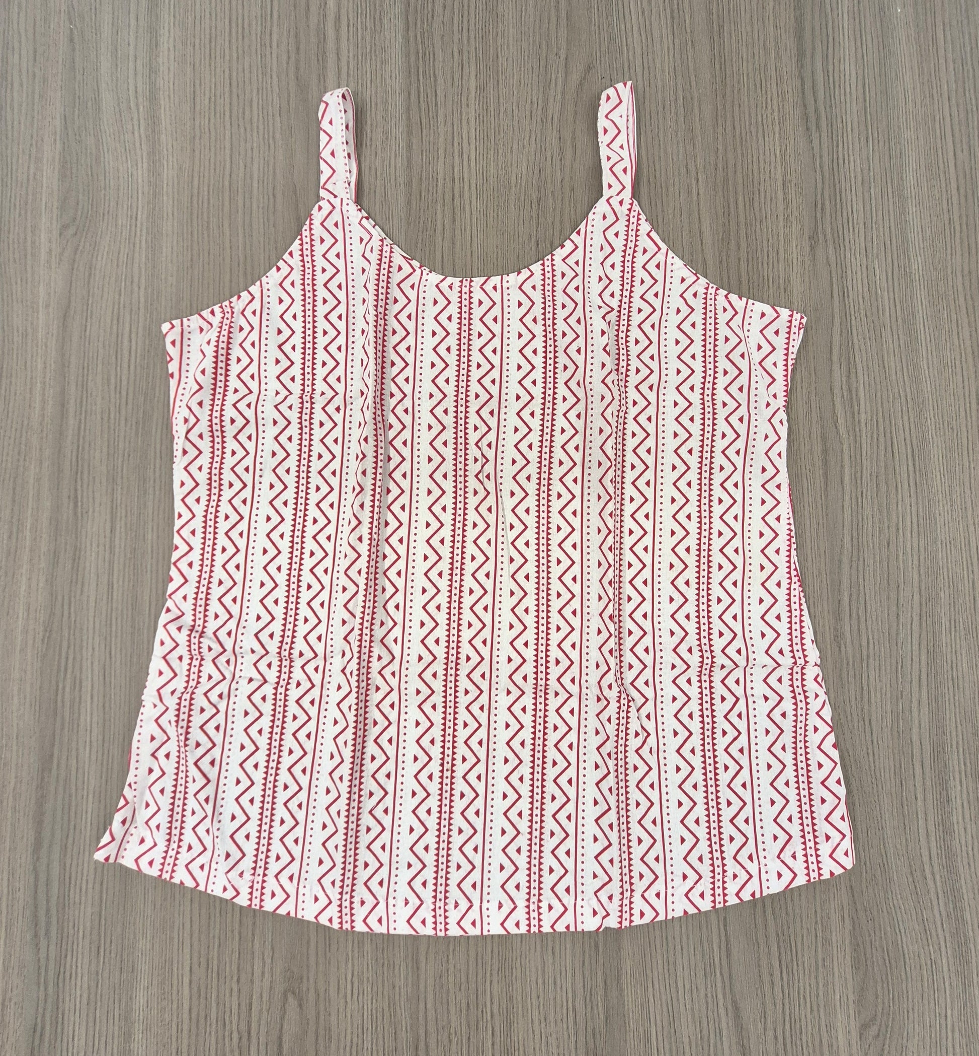 Stay effortlessly chic with this cotton spaghetti strap top, designed with a playful geometric print in vibrant red on white. Lightweight and breathable, this top is perfect for layering under jackets or pairing with jeans, shorts, or skirts for a casual summer look. Its soft cotton fabric ensures all-day comfort, while the adjustable-feel straps give it a flattering fit.